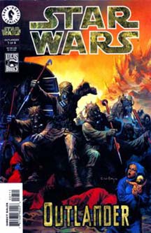 Sharad Hett is another compelling ex-Jedi. He joined the Tusken Raiders because he regretted not seeing his mom and dad more often before they were killed. This inspired him to respectfully leave the Jedi Order, which forbids attachment, in order to join a society where he could have a kid and train him as his Padawan. Why he would choose the vicious Tusken Raiders is questionable (circumstance, I suppose), but at least it allows “Outlander” to be set on Tatooine, which in turn allows Truman and the arc’s various artists to have a blast playing with Tuskens, Jawas, Jabba, skiffs and skiff guards, banthas, dewbacks, landspeeders, and so forth.