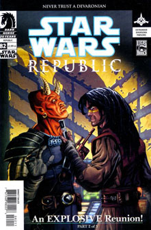 Along with Issue 78, two other issues of “Republic” take place after the Republic turns into the Empire. In retrospect, Issues 79-80 (“Into the Unknown”) should’ve been the first two issues of “Dark Times,” which launched in late 2006 but still continued the “Republic” numbering system in the fine print on the inside flap. “Into the Unknown” is written by primary “Dark Times” writer Randy Stradley (under the pseudonym Welles Hartley) and illustrated in the painterly style of Douglas Wheatley (pencils) and Chirs Chuckry (colors). It introduces “Dark Times” main characters – and new allies in this age of the Empire – Dass Jennir, a Jedi, and Bomo Greenbark, a Nosaurian Separatist who defended his planet against Republic incursion.