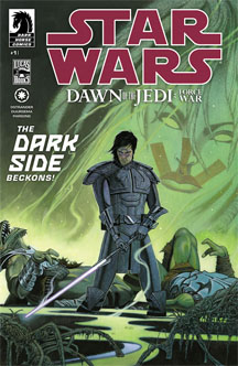 “Prisoner of Bogan” concludes with the Rakatan Infinite Empire learning Tython’s location from Trill, and “Force War” throws us smack-dab in the middle of the titular war. The leap forward in time between parts two and three seems out of character for Ostrander and Duursema, based on their meticulous story crafting in “Republic” and “Legacy.” The truce between the Je’daii leadership and Xesh and Lok happens off-panel, and other truncated concepts include a romance between Trill and Sek’nos Rath and more details about the nature of the conflict in the Despot War, of which Lok was the hero. I suspect Ostrander and Duursema opted to wrap up “Dawn” in just three miniseries due to the rumored shift of the license from Dark Horse to Marvel.