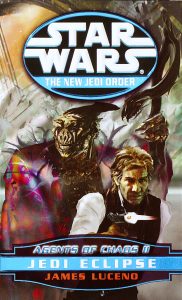 12. “The New Jedi Order: Agents of Chaos II: Jedi Eclipse” by James Luceno (2000) – This is a less robust Han novel than the first of the duology, but when Han and his Ryn friend Droma are chased through a grain field by a corrupt agricultural corporation on Ruan, it has definite echoes to a chase in “Han Solo at Stars’ End.” Also, Han meets a droid named Baffle, whom he mistakes for Bollux because he is the same model. Han’s cousin, “Corellian Trilogy” villain Thrackan Sal-Solo, comes back into play as he tries to manipulate Han’s children to his way of thinking. (Despite its evocative title, the “Corellian Trilogy” isn’t Han-centered enough to make this list. Also, it’s not very good.) (Full review)