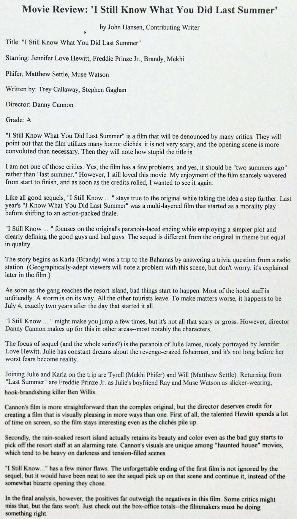 I have a soft spot for this movie, even though I now realize my A-rating from November 1998 is overly generous. Jennifer Love Hewitt returns as forever-haunted Julie James, and she has good chemistry with new best friend Karla (“Moesha’s” Brandy, whose acting career didn’t take off like I wish it would’ve).