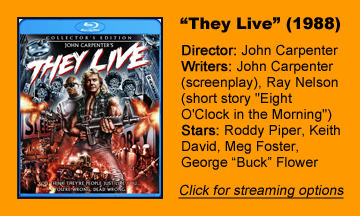 Writer-director John Carpenter’s “They Live” (1988) is technically about aliens infiltrating Earth and posing as humans, but the metaphor is so thinly veiled it’s hardly a metaphor at all. Drifter John Nada (Roddy Piper) recognizes these people are aliens by putting on magic sunglasses that reveal their zombie-faced nature.