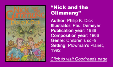 At 121 pages, “Nick and the Glimmung” is easy to read, but not among the most compelling of PKD’s longer short stories. I can imagine it would spark some imagination in sharp young readers who enjoy the various creatures on Plowman’s Planet, who Dick recycles from his other works — although again, it’s mostly the names his re-uses.