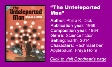 “The Unteleported Man” includes a framing story of a couple who mulls emigrating; the man hates his assembly-line job where his work is overseen by a pigeon (something Dick would replay in “Nick and the Glimmung”).