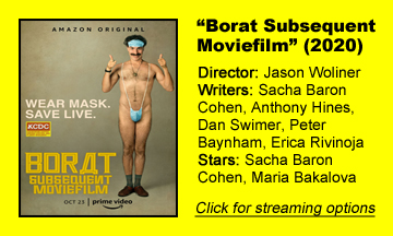 Fourteen years after the original “Borat,” there’s still no one who does this brand of comedy as well as Sacha Baron Cohen and his team. A mixture of candid-camera moments, improv acting, editing trickery – and a lot more scripted writing than they want you to know — “Borat Subsequent Moviefilm” (Amazon Prime) had me simultaneously laughing out loud and wondering what techniques they used to achieve these scenes.