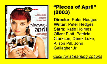 However, this central oddity of the film is not a deal-breaker. In fact, the mystery makes “Pieces of April” richer on each viewing. Hedges provides hints. We might be catching Joy — who has had a mastectomy, is regularly nauseous and might be in the process of dying at age 42 — on a bad day.