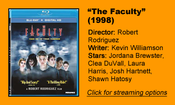 Although not entirely free of the shackles of its era, “The Faculty” is purposely a more timeless movie than “Disturbing Behavior,” as writer Kevin Williamson (“Scream,” “Dawson’s Creek”) moves the premise of John Carpenter’s “The Thing” to a high school and switches the mood from deadly serious to cleverly hammy.