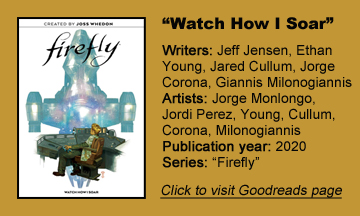 “Watch How I Soar” is a reflective, tangential volume. The stories are written and drawn with love for Wash, but are not memorable or essential. To put it kindly, they are ephemeral. To put it cynically, I wonder if this is something Joss Whedon allowed Boom! to put out while he shapes more essential backstories for, say, Inara or Kaylee.