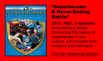 If you’re a fan of superheroes thanks to the 2010s cinema boom and are curious about their history in comics, “Superheroes: A Never-Ending Battle” (2013), a three-part PBS documentary, is a nice overview. Hosted by Liev Schreiber (Sabretooth in the “Wolverine” films), it’s aimed at a wide audience in a somewhat academic tone, but I – as a mid-level superhero/comics fan – learned several tidbits and had fun watching it.