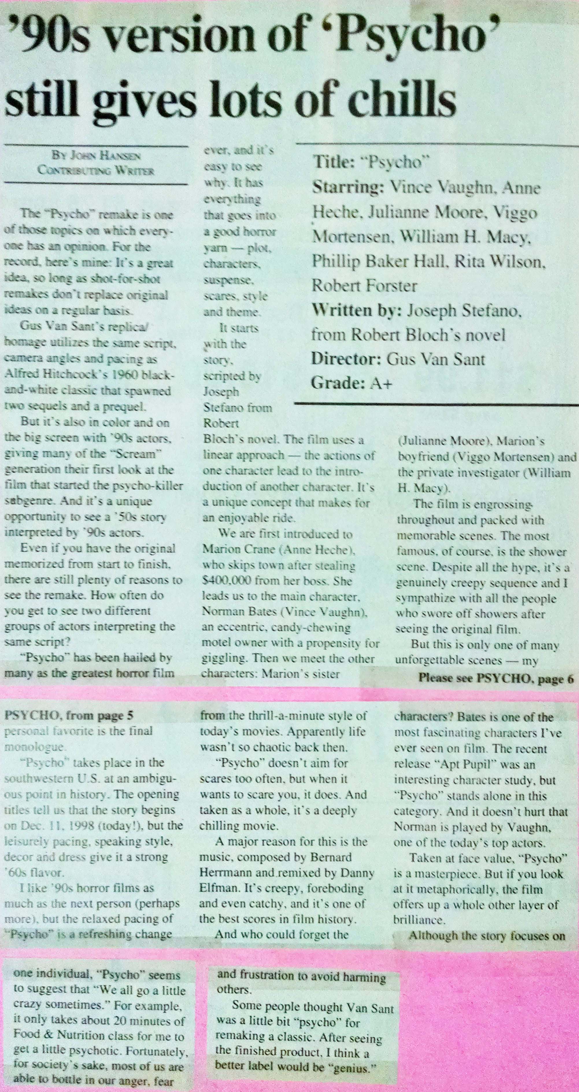 John’s “Psycho” (1998) review, NDSU Spectrum, December 1998