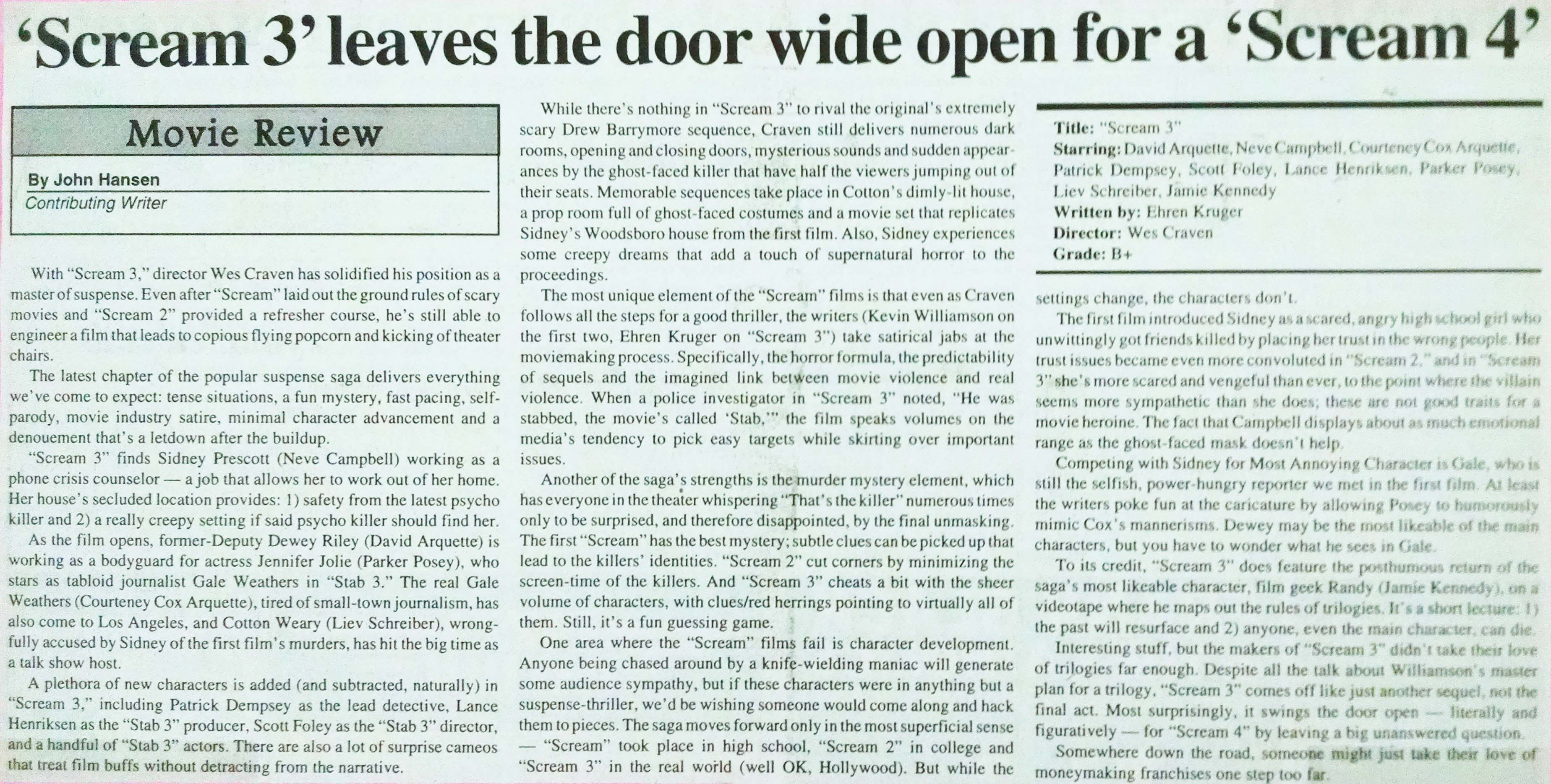 John’s “Scream 3” review, NDSU Spectrum, February 2000