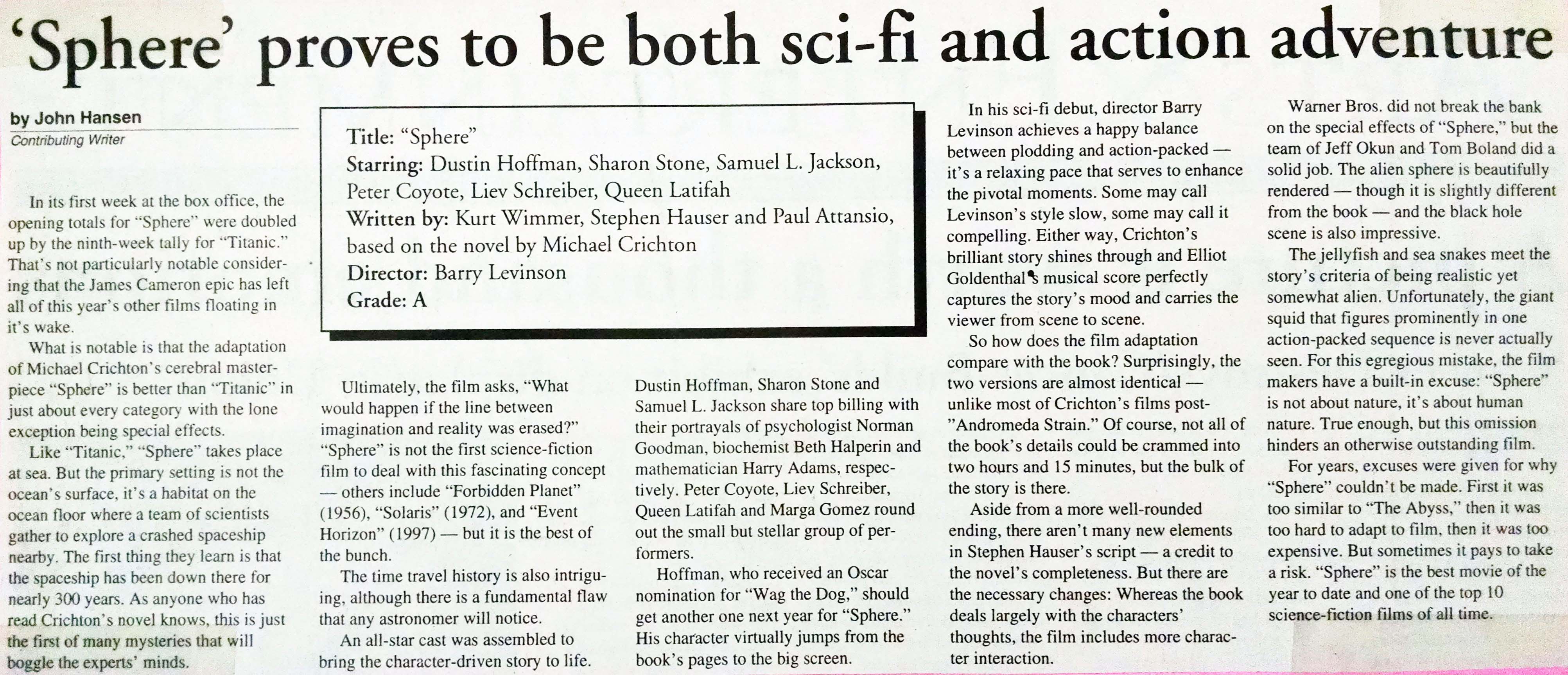 John’s “Sphere” review, NDSU Spectrum, February 1998