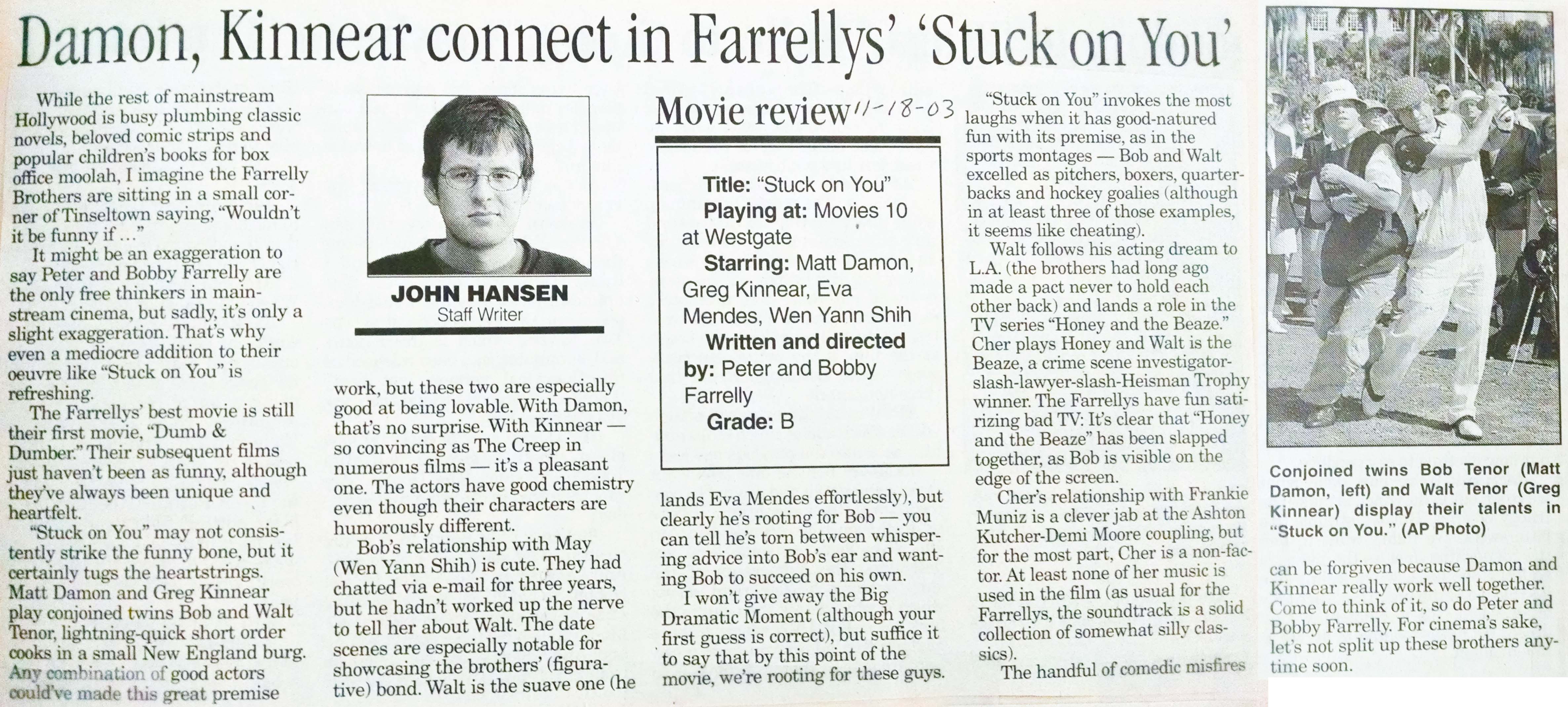 My “Stuck on You” review, Brainerd Dispatch, Nov. 18, 2003